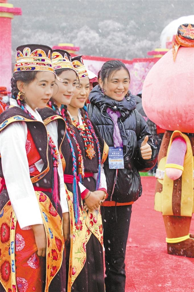 图为在巴宜区工布原乡景区主会场举行的林芝市第二十届桃花文化旅游节开幕式上,受邀嘉宾与身着工布藏装的工作人员合影。