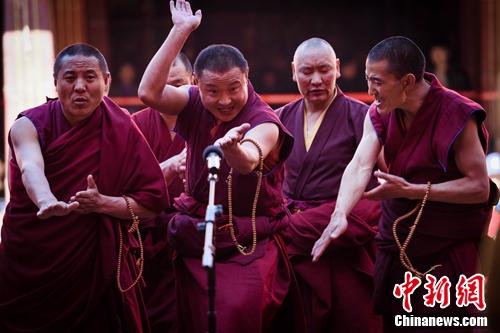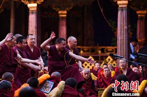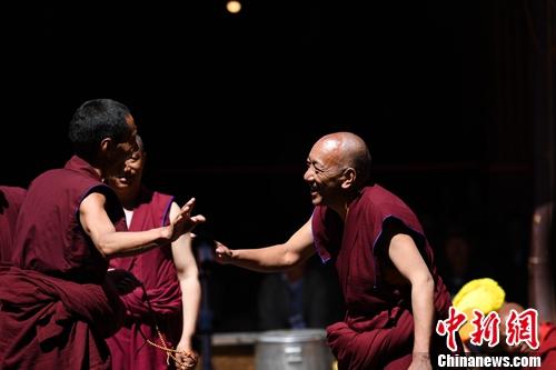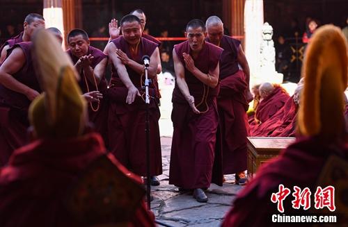 26日,西藏拉萨大昭寺内击掌声、辩经声不绝于耳,一年一度的藏传佛教格鲁派学经僧人考核晋升格西拉让巴学位立宗答辩暨颁证仪式在该寺大经堂前的千佛廊举行。