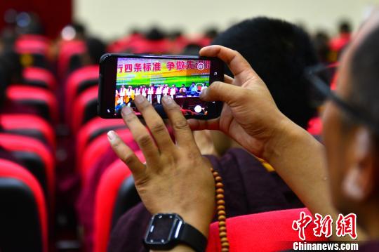西藏佛学院学员用手机记录毕业典礼。江飞波 摄