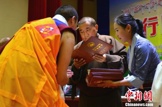 西藏佛学院院长珠康·土登克珠(中)为学员颁发毕业证书。江飞波 摄
