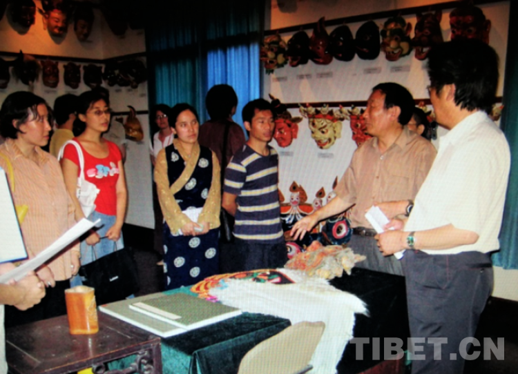 图为2006年6月,在西南民大博物馆《格萨尔》展室,杨嘉铭先生(右二)热情解答参观者提问。