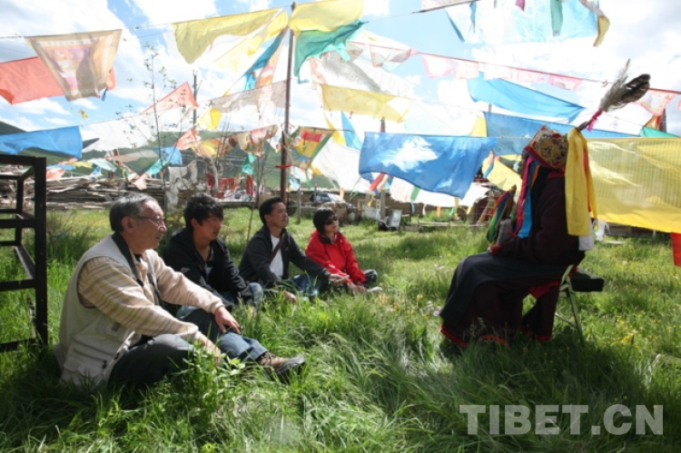 图为2010年7月,说唱艺人俄珍卓玛在家中庭院里为我们说唱她从石头里看到的史诗《格萨尔》。杨嘉铭先生为前一,红衣者为作者,旁左为色达县文化旅游局副局长四朗彭措。