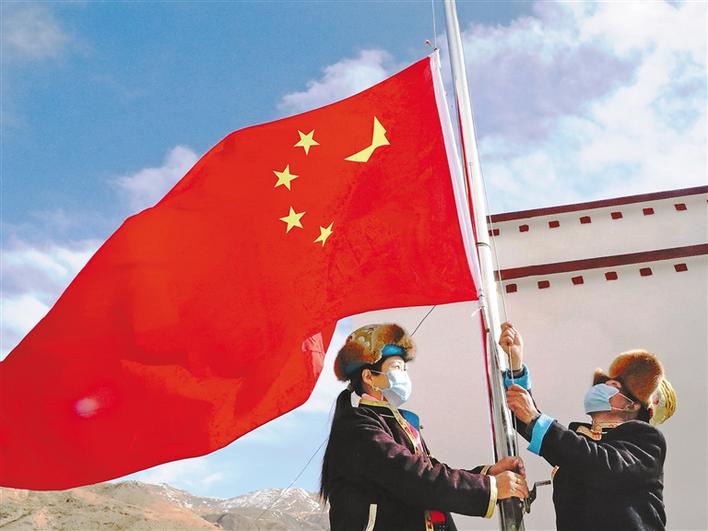 图为措美县哲古镇卓德村群众在升国旗。记者 段敏 摄