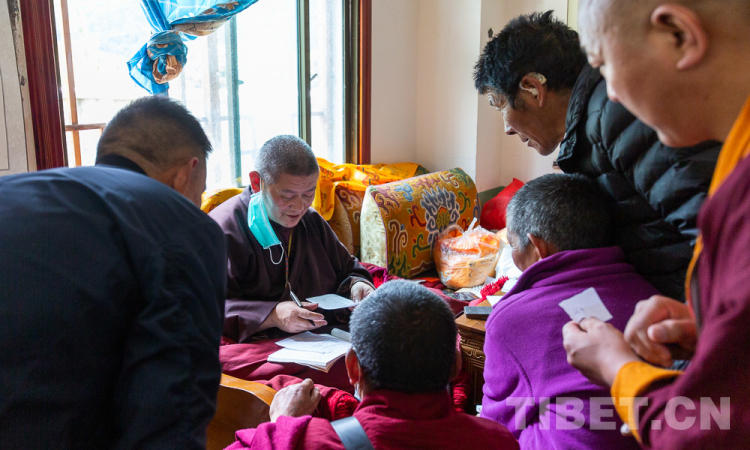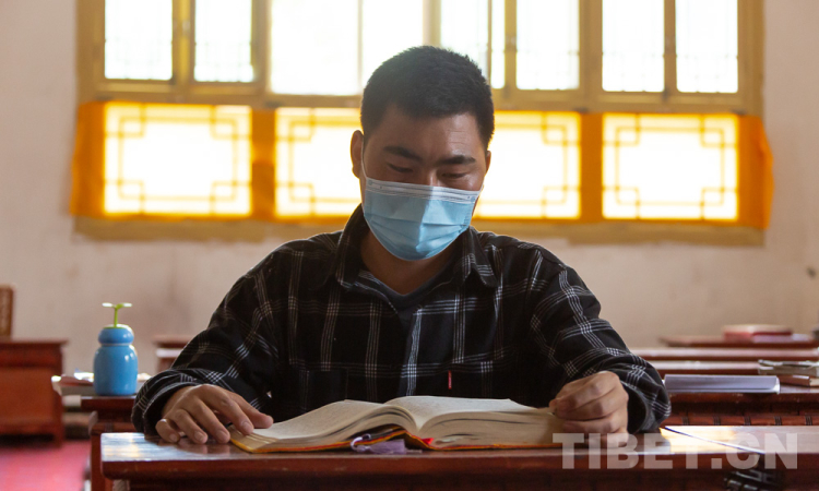 图为索朗江白正在诵读《四部医典》 摄影:赵耀