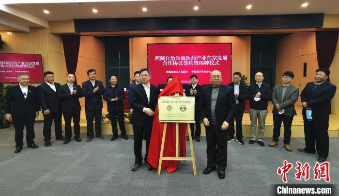 3月23日,西藏自治区政府、中国藏学研究中心在北京联合举办西藏自治区藏医药产业在京发展合作协议签约暨揭牌仪式。图为“西藏藏医药产业科技创新联盟”揭牌仪式。中新社记者 刘大炜摄