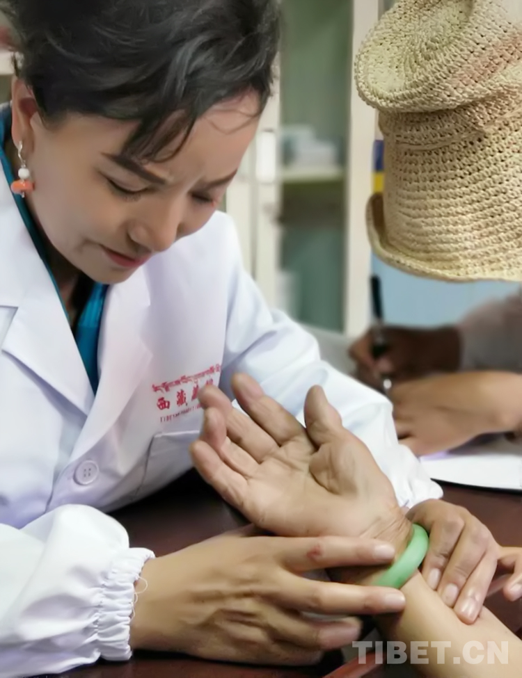图为全国政协委员、西藏藏医药大学副教授明吉措姆为患者诊疗
