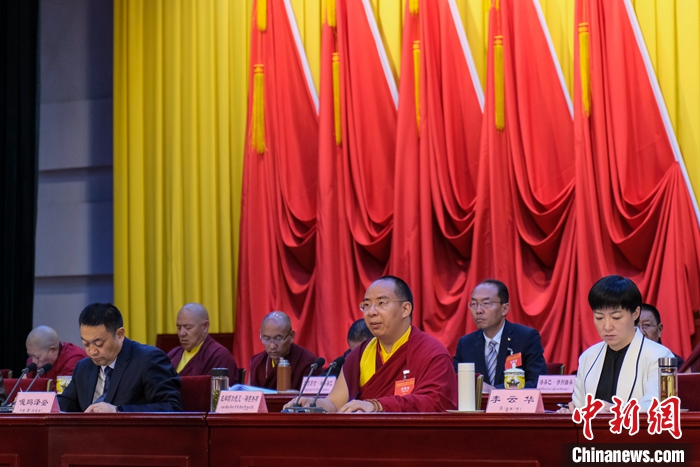 图为7月11日,中国佛教协会西藏分会年度理事会议现场班禅作工作报告。 中新社记者 江飞波 摄