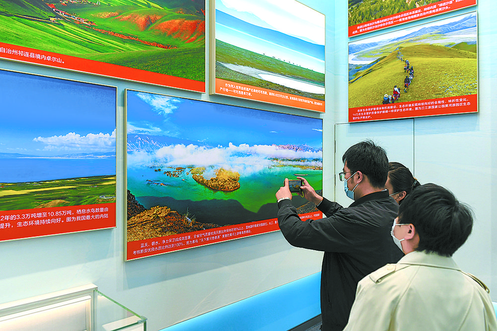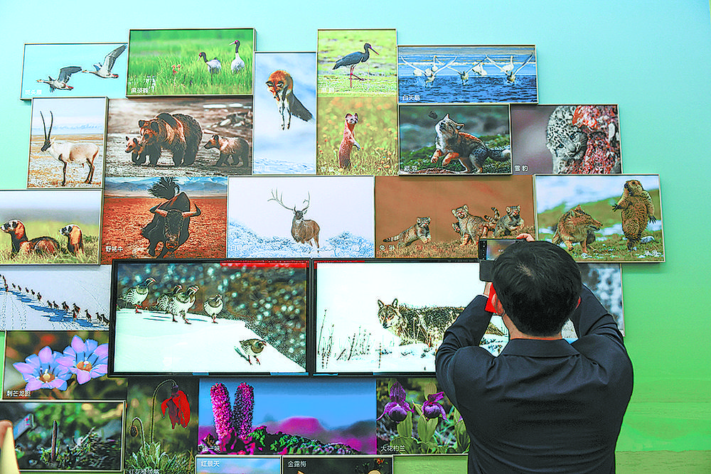 雪豹、兔狲、黑颈鹤、马麝、广布红门兰、水母雪兔子、红花绿绒蒿……青海特有的动植物照片墙吸引观众驻足,珍稀动物的生活智慧和罕见植物的生长历程通过摄影师的镜头,向世界展示了青海生物多样性保护取得的显著成就。