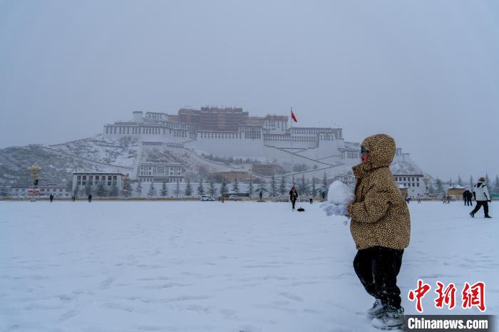 图为1月18日,拉萨迎来2024年首场大雪,一位孩子在布达拉宫广场玩雪。江飞波 摄