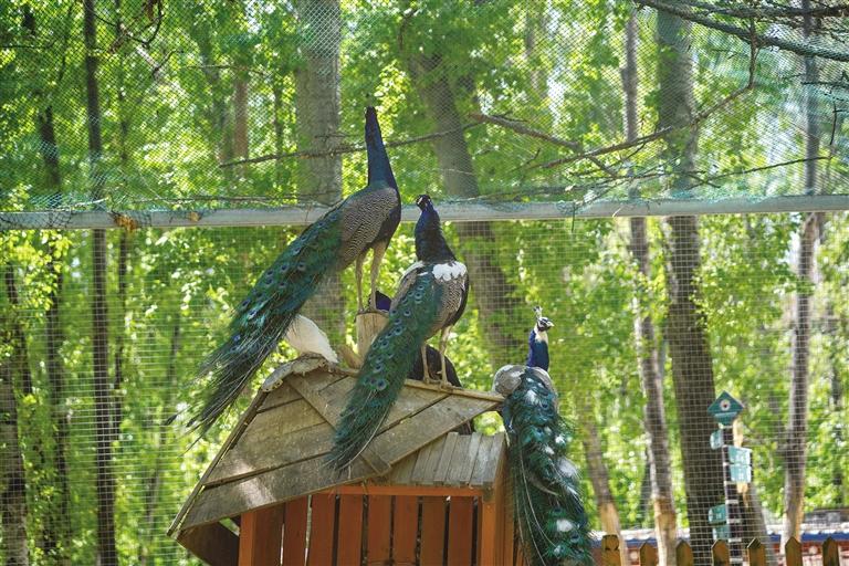 乘着观光车前行,一路都被绿叶青草围绕。观赏完动物,记者一行在动物园内的餐厅就餐,等待美食的过程中,点一杯咖啡或甜茶,看着蓝天白云和满眼绿意,不时还能听到孔雀啼鸣,别有一番滋味。