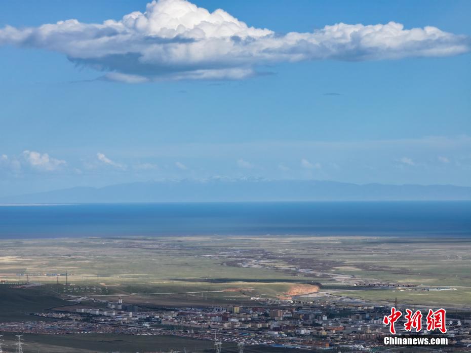 6月4日,航拍青海省海北藏族自治州刚察县境内青海湖岸畔。地处青海湖北岸的刚察县,被称作“海滨藏城”,夏日,连绵的草原绿草萋萋,成群牛羊在山间觅食,远处的青海湖水天一色,若隐若现,风光秀美。(无人机照片)