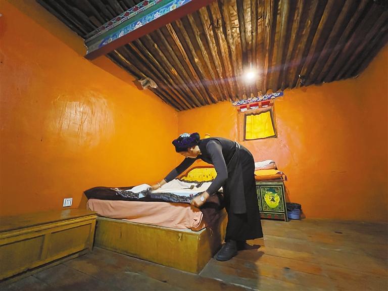 扎西顿珠的妻子在进行客房清洁。