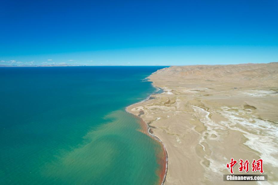 国庆期间,中新网记者自驾西藏藏北羌塘草原,途经“天湖”纳木错,高原盐湖班戈湖以及西藏第一大湖色林错等地。秋天高原蓝天白云的映衬下,藏北湖泊犹如一面面巨大的“宝石蓝”镜子镶嵌于高原大地,景色壮丽。图为10月4日,航拍西藏色林错水天相接。