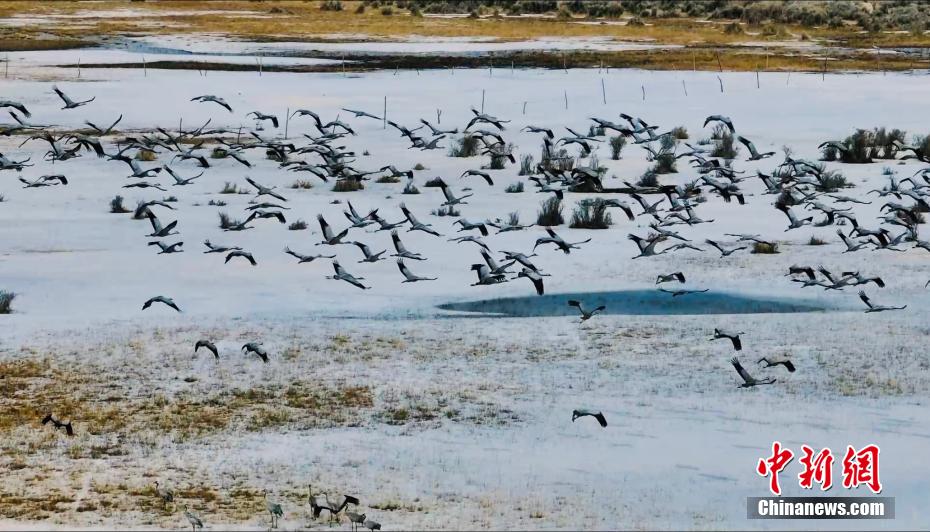连日来,成群灰鹤聚集于青海省海西蒙古族藏族自治州都兰县巴隆乡铁丝盖地区。灰鹤是国家二级重点保护野生动物。图为灰鹤飞舞。