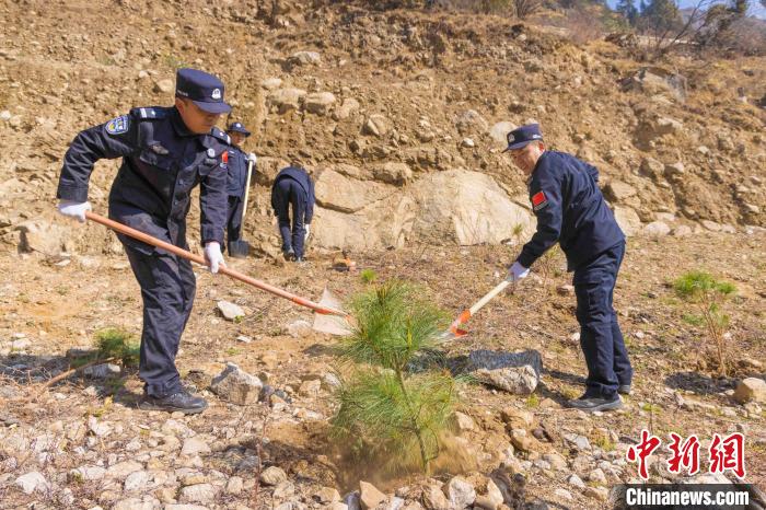 图为民警挥锹铲土栽种树苗。李锦辉 摄