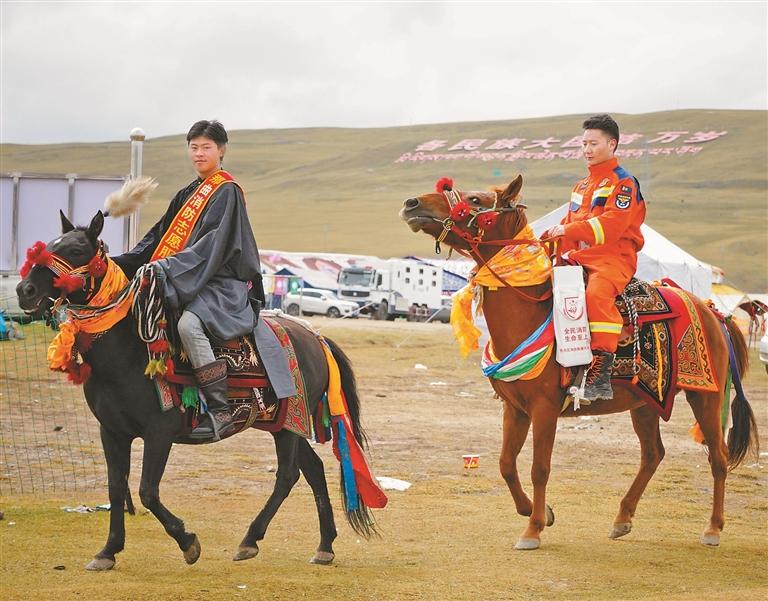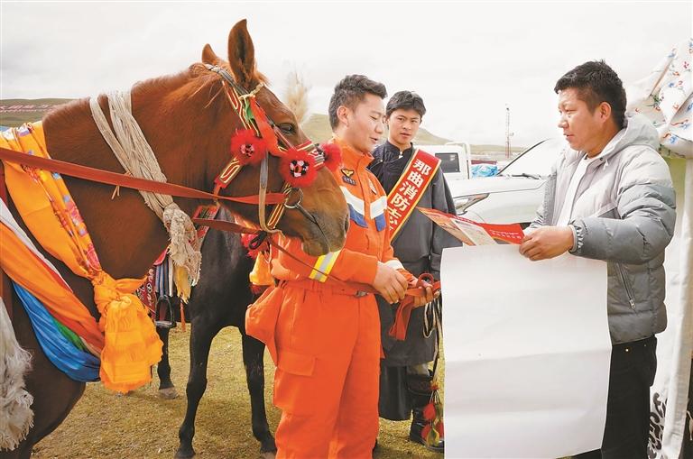 在那曲市广阔的赛马场上,一支特殊的“马背上的消防宣传服务队”近日成为亮丽风景。为保障2025年那曲市恰青赛马节期间消防安全,那曲市消防救援支队创新工作方法,联合那曲市马术协会工作人员与消防志愿者,骑马深入牧民帐篷营地及赛事区域,将消防安全知识送至每一位群众身边。