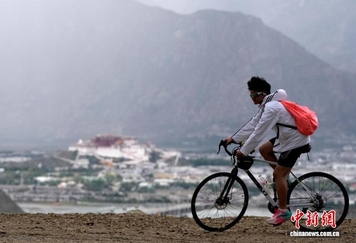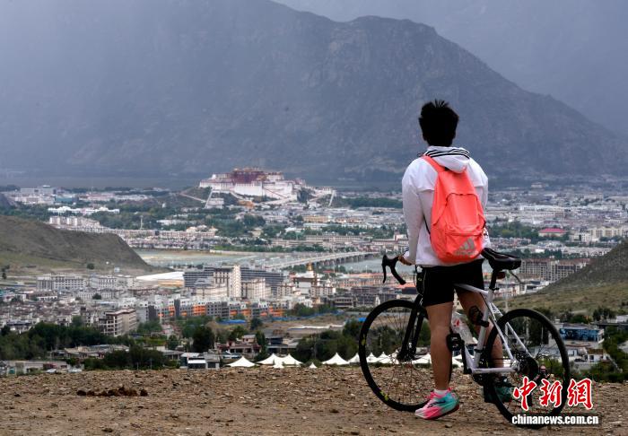 9月11日,骑自行车的民众在拉萨天堂草原自然风景区与布达拉宫合影。天堂草原自然风景区位于拉萨河南岸,与布达拉宫隔河相望。凭借独特的生态地理优势和秀美的自然风景,这里吸引了众多民众前来打卡、拍照。中新社记者 李林 摄