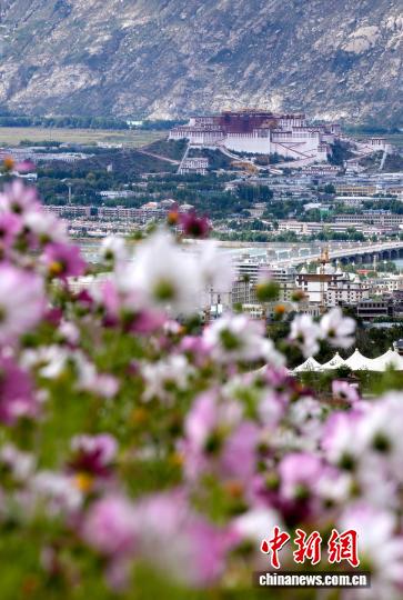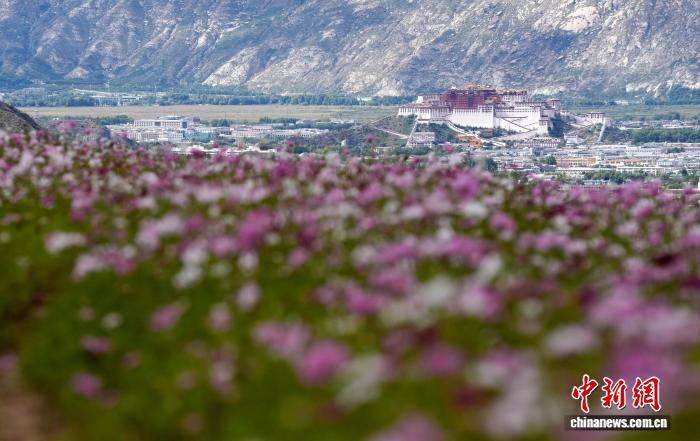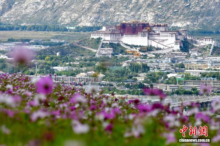 9月11日,拉萨天堂草原自然风景区绽放的花朵与远处的布达拉宫。天堂草原自然风景区位于拉萨河南岸,与布达拉宫隔河相望。凭借独特的生态地理优势和秀美的自然风景,这里吸引了众多民众前来打卡、拍照。中新社记者 李林 摄