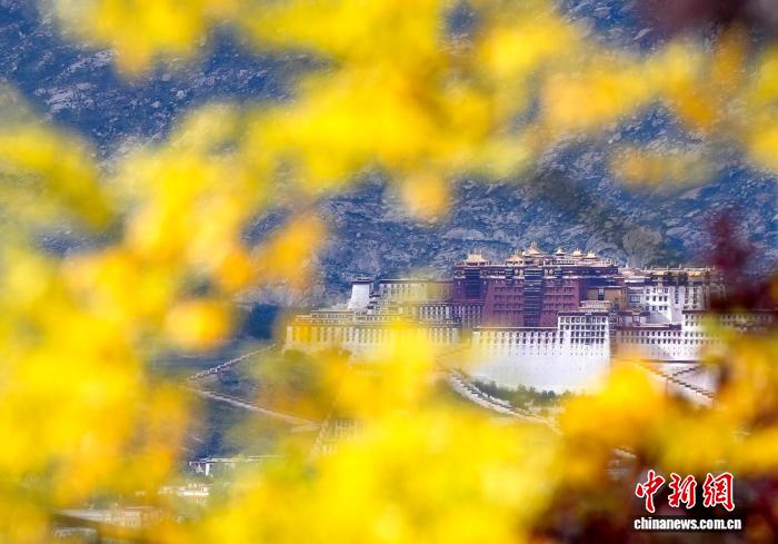 9月11日,拉萨天堂草原自然风景区的黄叶与远处的布达拉宫。随着温度逐渐下降,拉萨市区树叶逐渐变黄,展现秋日景色。中新社记者 李林 摄