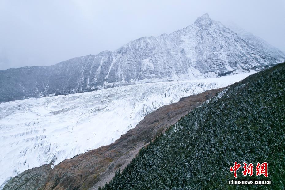 西藏依嘎冰川位于那曲市嘉黎县尼屋乡依嘎村,地处东念青唐古拉山脉深处,是那曲与林芝的交界地带。据悉,依嘎冰川主峰海拔6600米,冰舌末端海拔约4000米,落差达2600米。近日,中新网记者自驾途经依嘎冰川看到,周边山势陡峭、险峻,植被丰富,此外该冰川还拥有冰瀑布以及清晰的冰川纹路等,十分壮阔。图为10月17日,航拍依嘎冰川与周边的原始森林。