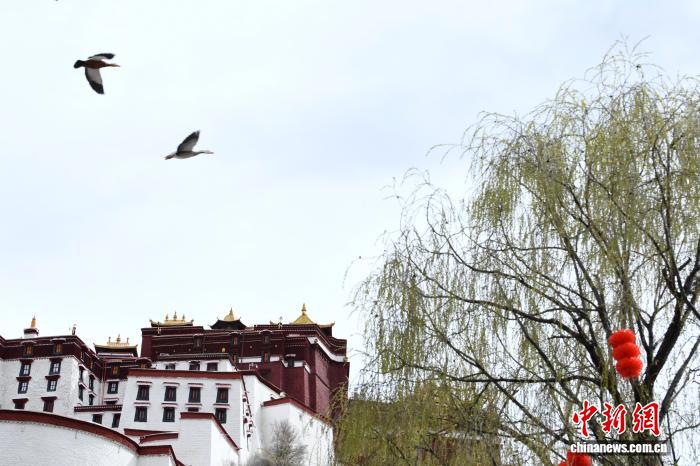 3月8日,西藏拉萨宗角禄康公园,杨柳发芽。阳春三月,古城拉萨桃花初放、生机盎然,春意渐浓。中新社记者 贡嘎来松 摄