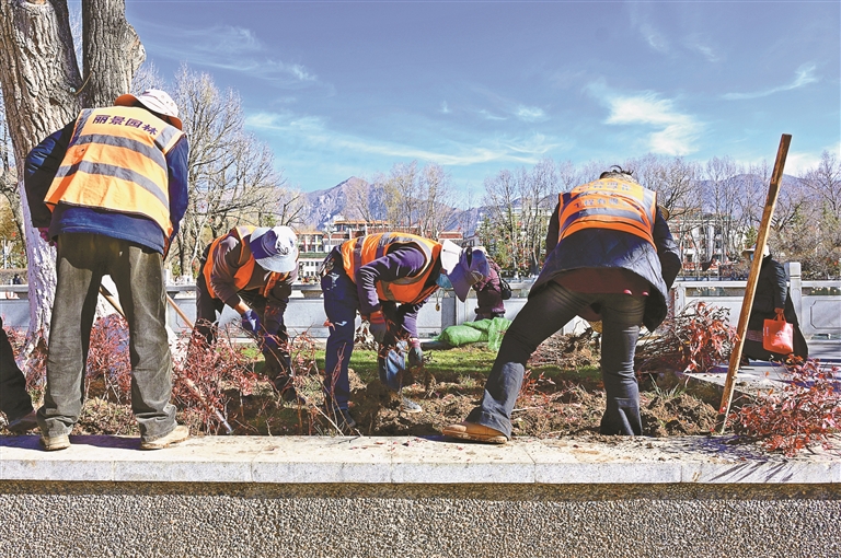 阳春三月,雪域高原春意渐浓。在拉萨市区的一处公园绿地内,园林工人们正抢抓春季绿化黄金期,开展苗木栽植作业。