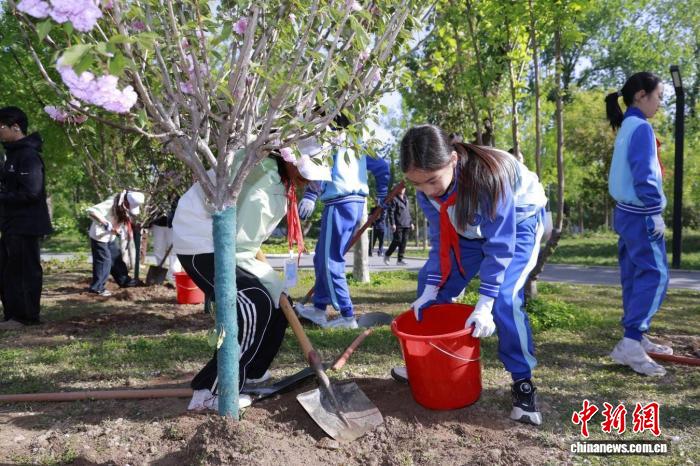 图为活动现场,来自北京和西藏的青少年共同参与植树活动。(中国宋庆龄青少年科技文化交流中心 供图)