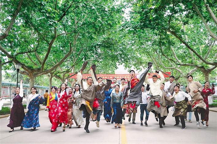 毕业后的西藏民族大学2018届的学生们走在校园的林荫道上。通讯员 恰多 摄