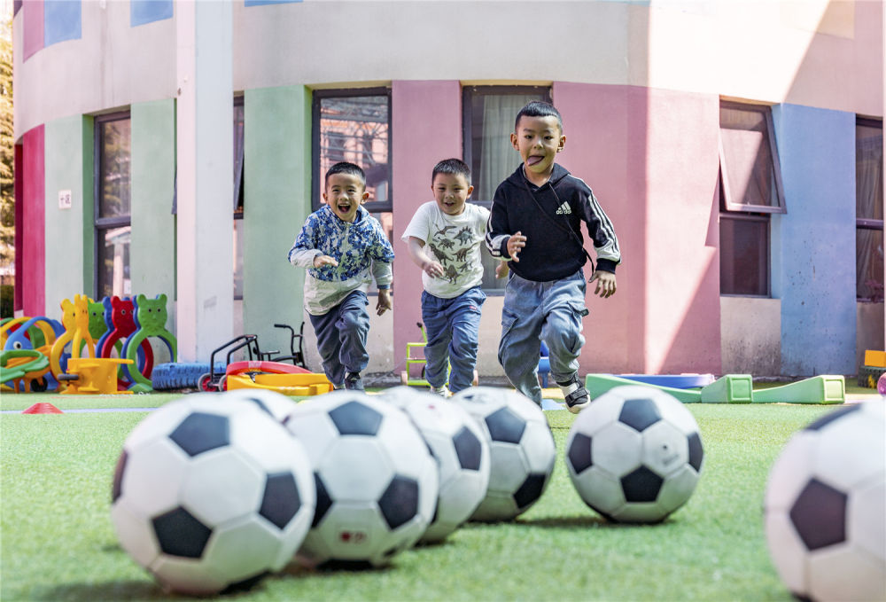 这是西藏自治区实验幼儿园大班的孩子们进行足球训练(2019年8月22日摄)。新华社记者 孙非摄