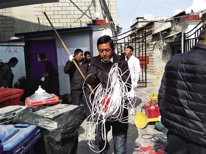 扎西顿珠清理社区角落堆放的杂物。