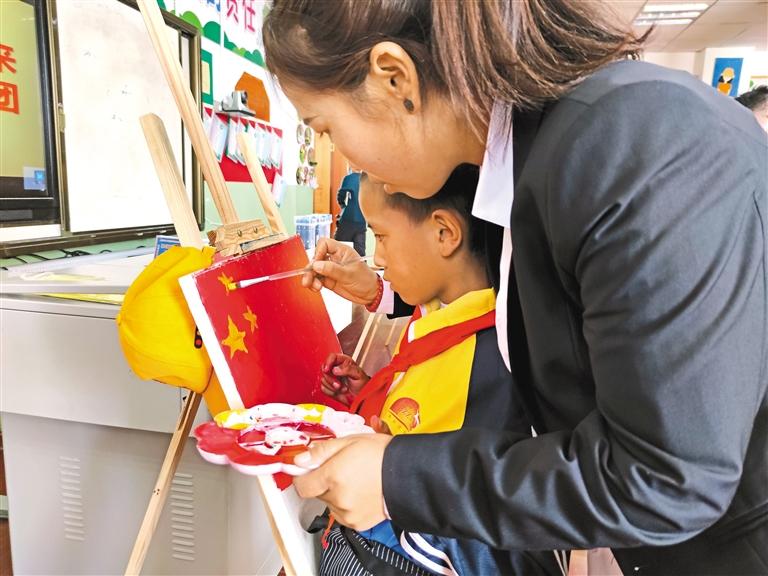 在桑珠孜区东嘎乡中心小学少年宫,绘画爱好者在辅导老师的指导下描画国旗