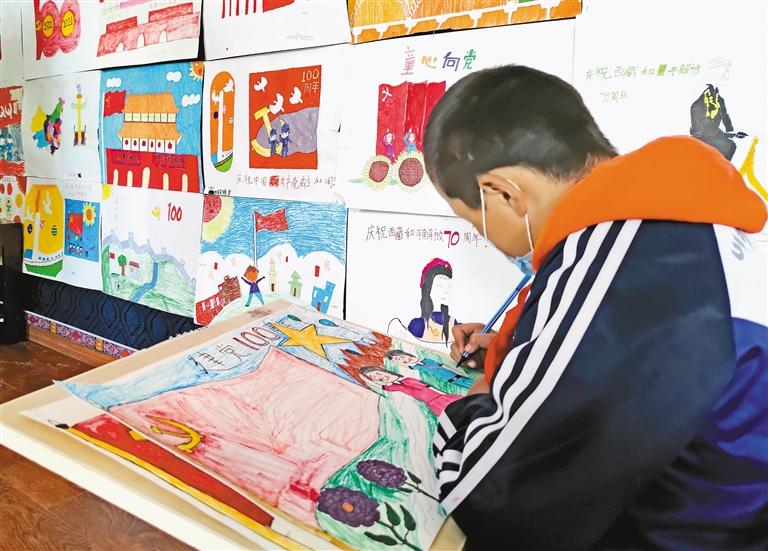 在白朗县嘎东镇中心小学少年宫,绘画爱好者创作“庆祝建党100周年”主题画。记者 汪纯 摄