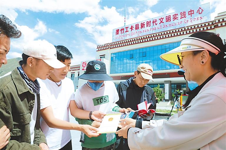 近日,墨竹工卡县开展新时代文明实践志愿服务活动。在活动现场,各参与单位为群众发放宣传手册、书籍和雨伞、水杯等物品,向群众宣传讲解相关知识,还以免费理发、免费修电脑等方式为现场群众开展了送温暖、送科技、送法律活动,进一步提高了群众对各项政策的知晓度,丰富了群众的文化生活。