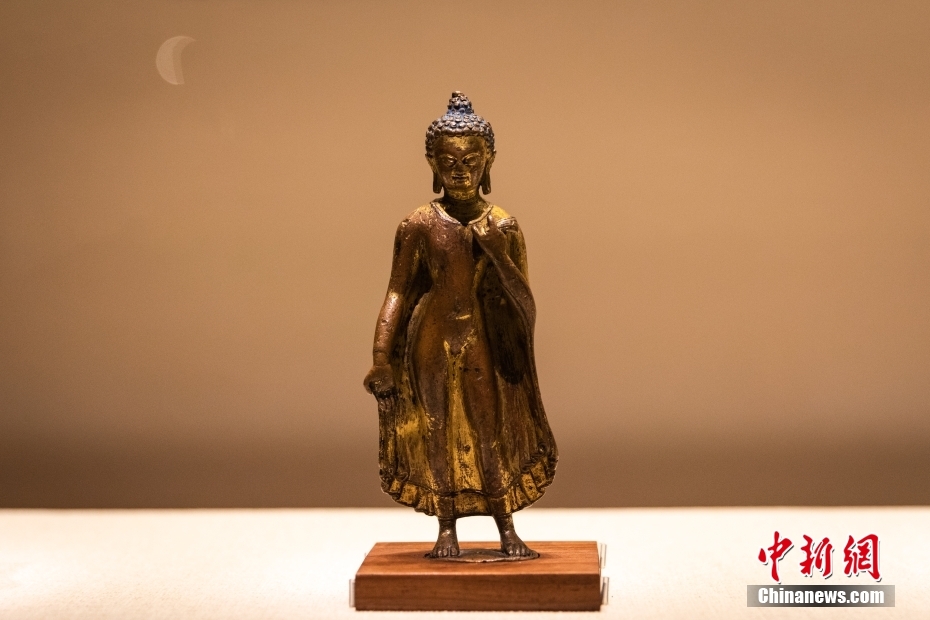 8月18日,甘肃省敦煌市,“灿烂记忆:从美索不达米亚到犍陀罗——东方文明古国冶金术展”在敦煌莫高窟揭幕。此次展览是敦煌研究院与日本平山郁夫丝绸之路美术馆近年第三次合作,展览共展出从地中海沿岸,到中亚丝绸之路沿线国家的金属类文物221组件、丝路钱币33枚,时间跨度长达4000多年、范围遍及欧亚大陆的丝绸之路上各大文明区域冶金术的变化图景。图为参展展品佛陀立像。 中新社发 王嘉奇 摄