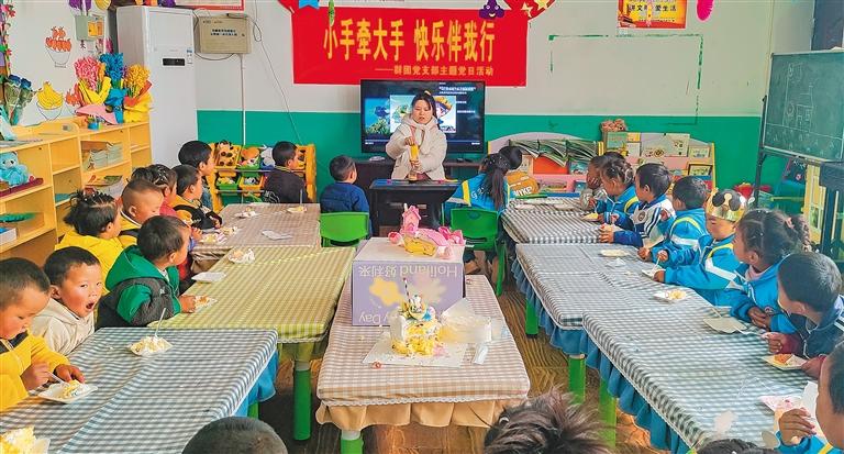近日,山南市措美县群团党支部在该县古堆乡帕仓村幼儿园开展“小手牵大手,快乐伴我行”主题党日活动,与孩子们一起讲红色故事、唱儿歌、做游戏、吃蛋糕,为孩子们健康成长加油助力。