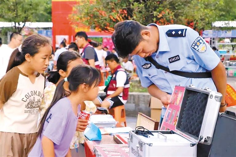图为民警在为小朋友们介绍警用装备。记者 张猛 摄