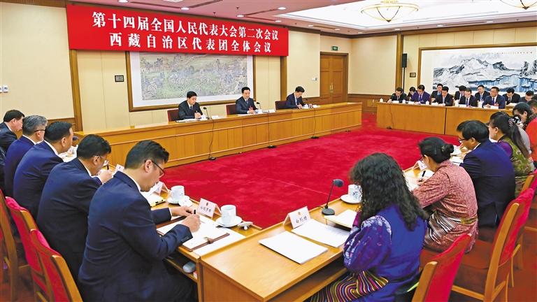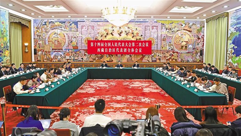 3月6日,西藏代表团举行全体会议,传达学习习近平总书记在参加十四届全国人大二次会议江苏代表团审议时的重要讲话精神,继续审议政府工作报告,审查计划报告和草案、预算报告和草案。