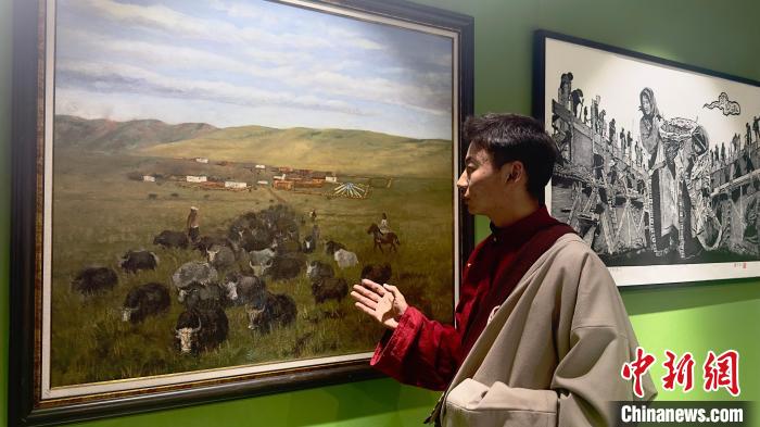 大赛美术组二等奖获得者、西藏大学艺术学院美术系研一学生郭扎正在向观众展示自己的美术作品。泽塔雍措 摄