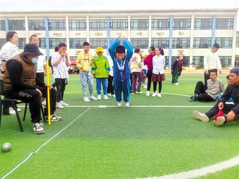 拉萨市第三小学学生参加立定跳远项目比赛。记者 次仁平措 摄