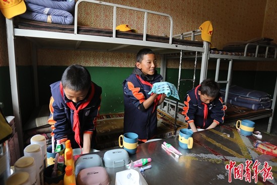 9月14日,西藏那曲市班戈县第二(中石化)小学,学生们午休后在宿舍里洗漱。部分离家较远的学生,可以选择读书期间全程住校,生活起居都有专门的老师照顾。中青报·中青网记者 孔斯琪 摄