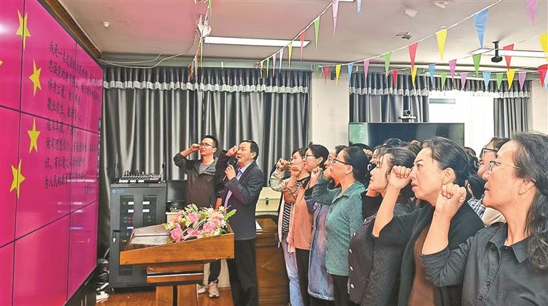 图为拉萨市师范学校附属小学的教师们在教师节这天庄严宣誓,坚守教育初心。胡舟 记者 次仁平措 摄