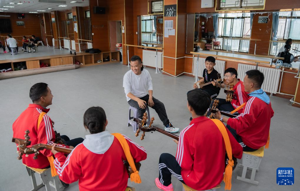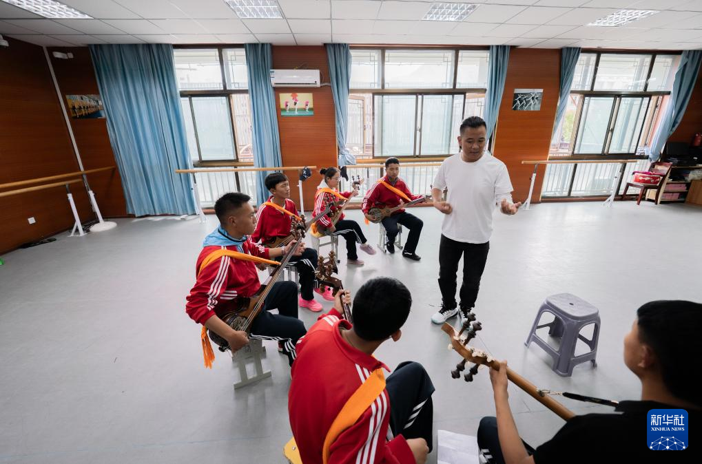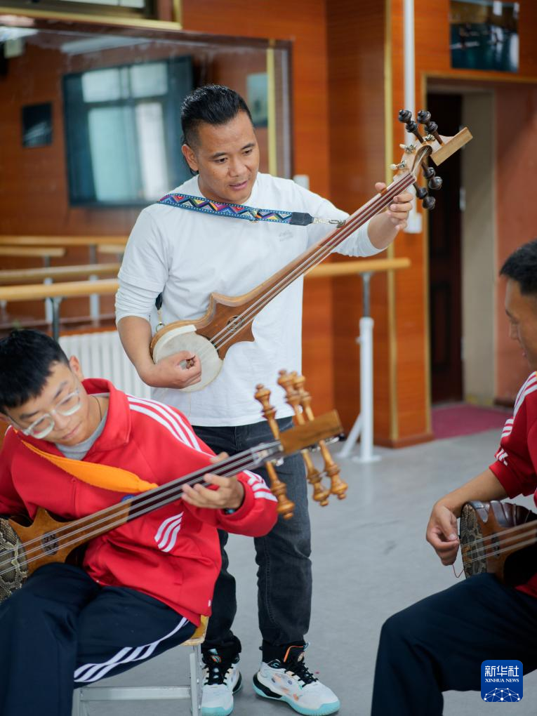 9月9日,在拉萨市第二中等职业技术学校,洛桑次仁老师在纠正孩子们弹奏扎念琴的动作。新华社记者 张笑宇 摄