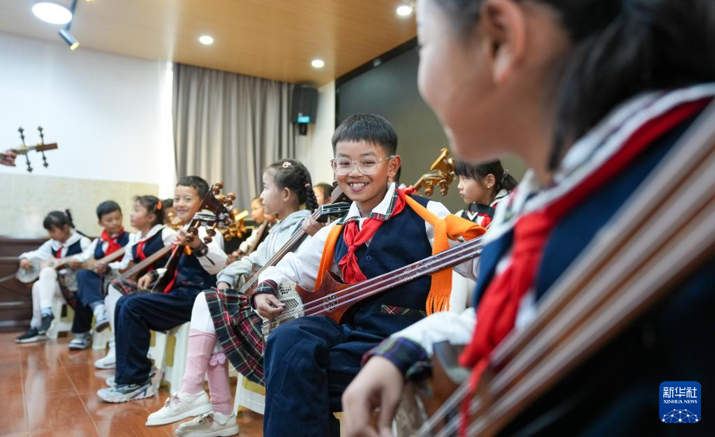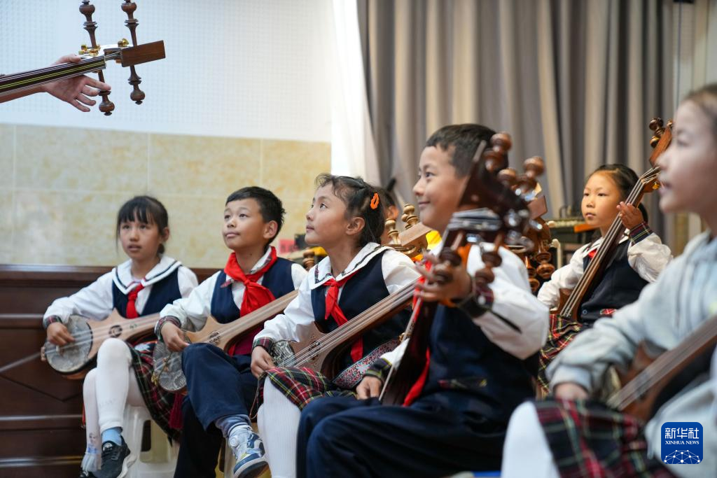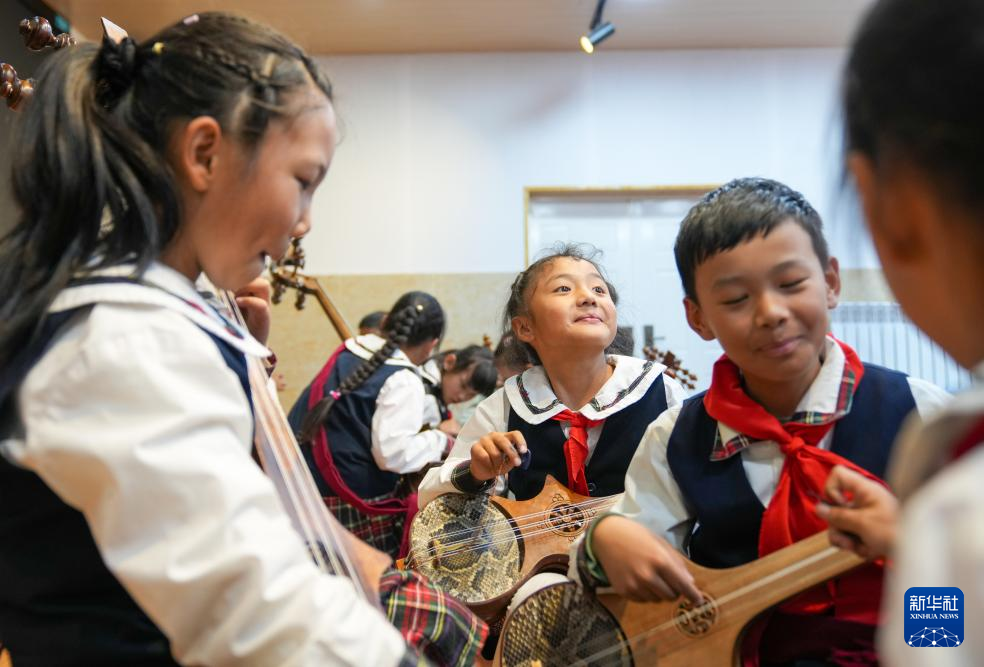 9月11日,在拉萨市实验小学,孩子们在弹奏扎念琴。新华社记者 晋美多吉 摄