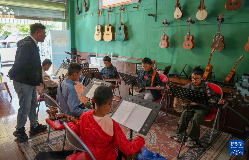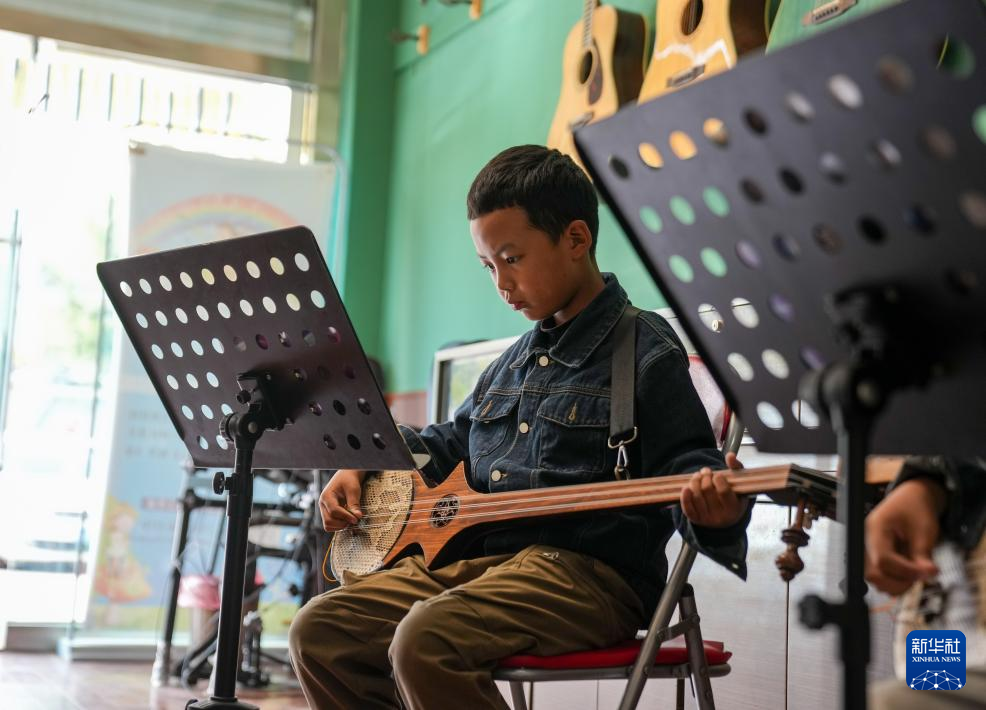 9月13日,在拉萨市古乐扎念琴行,孩子们在弹奏扎念琴。新华社记者 晋美多吉 摄