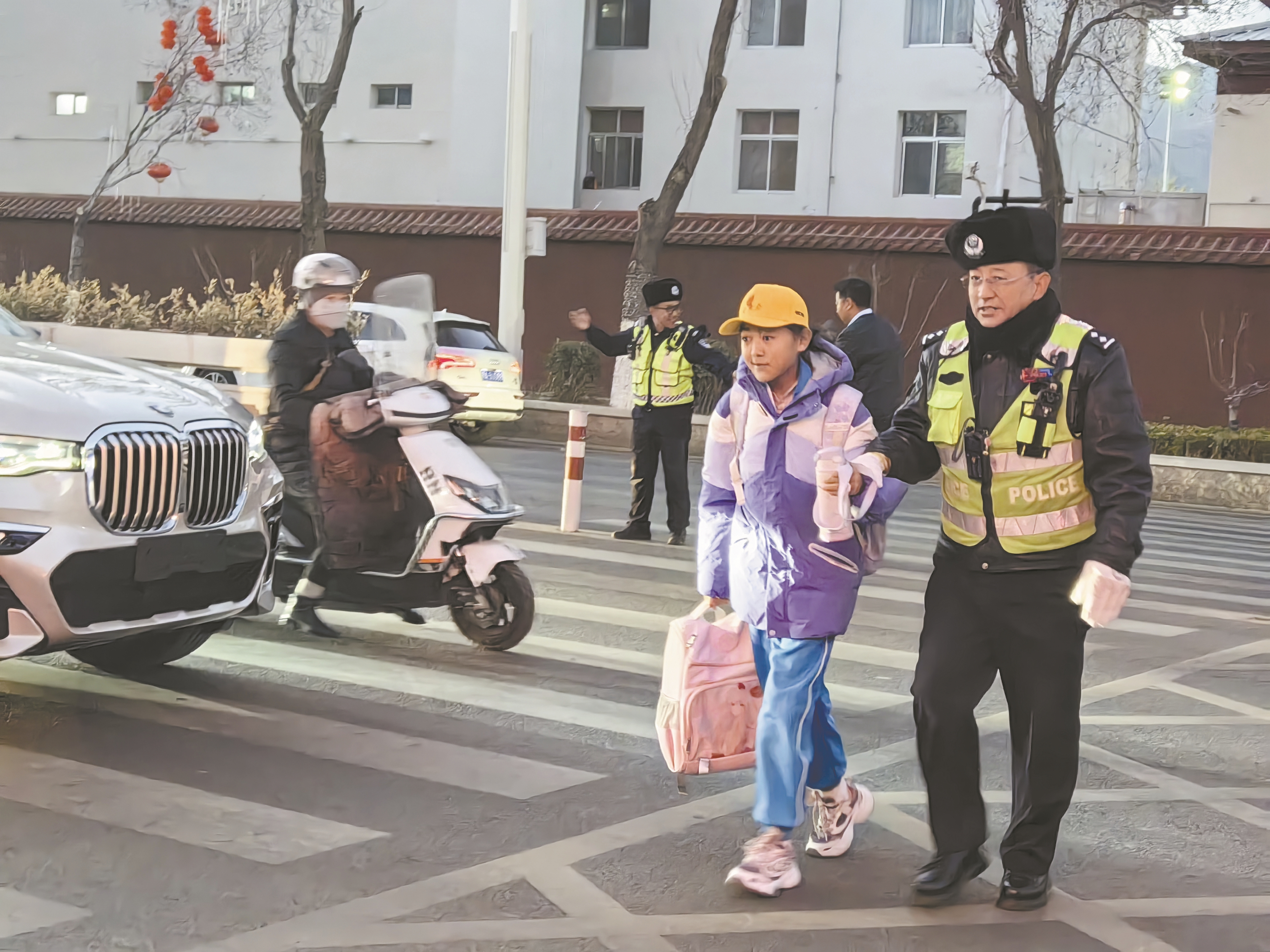 在有序疏导交通的同时,民警们主动牵起低年级学生的小手,安全护送过街,提醒学生注意路况,用温暖举动守护每一名学生平安入校,成为校园门口最安心的“荧光绿防线”。