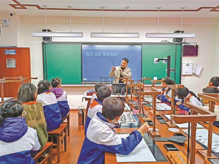 他将这份对书法的深刻理解,毫无保留地倾注到教学中。他开始受邀在拉萨市实验小学、拉萨江苏实验中学等多所学校举办公益讲座与培训,在与孩子们切磋交流的过程中,他不断反思并完善自己的教学理念。