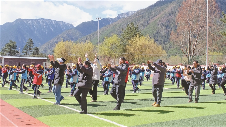 学校师生正在跳融入了珞巴舞蹈元素的课间操。