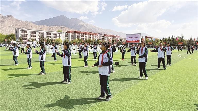 值得关注的是,部分学校的学生现场展示了民族操与武术,吸引了在场师生的目光。拉萨北京实验中学初二学生卓嘎说,如今学校课间已延长至15分钟,大家有充足的时间放松休息。她平时很喜欢打羽毛球,偶尔也会参加网球课程,每天的体育锻炼时间能达到2小时以上。