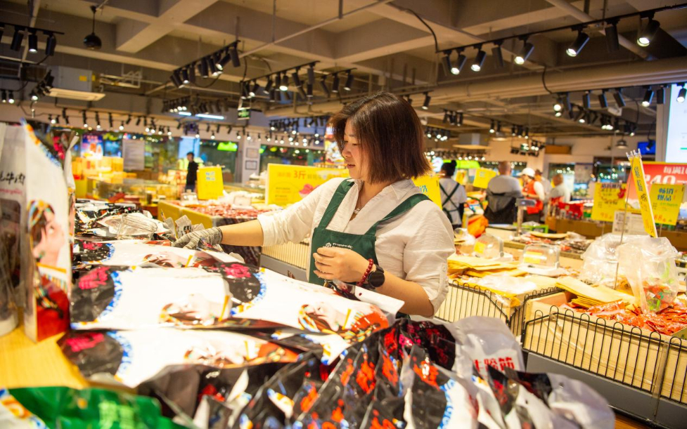 店员在西藏特产仓储超市乃仓店摆放商品。