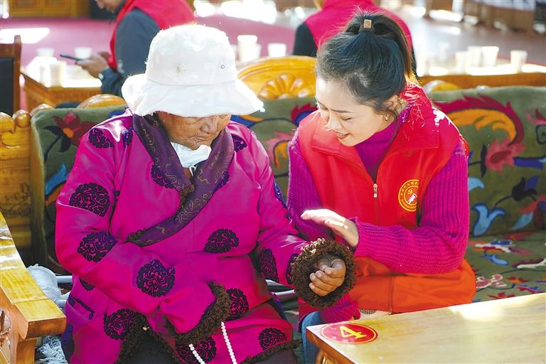 图为那曲市索县新时代文明实践中心为特困人员集中供养服务中心的老人送去关心和关爱。 记者 曲珍 通讯员 王霖 摄